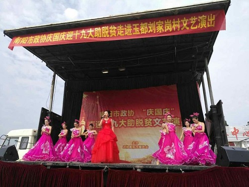 玉都网讯 (通讯员 徐翔) 九月二十九号上午九点,由南阳市政协主办,镇平县政协及玉都街道办事处协办的“喜迎十九大助力脱贫攻坚文艺汇演”走进刘家岗村,为来自刘家岗村的二百余名贫困群众送上了一场丰富多彩的文化盛宴。此次演出内容丰富贴近生活,形式多样生动活泼,有演唱,小品,戏曲,鼓词等。现场气氛热烈,精彩不断,我市著名歌唱家门红霞的一曲女声独唱亲不过老百姓,小品真贫假贫,精准扶贫喜盈门等节目赢得了群众阵阵掌声。通过喜闻乐见的文艺演出,刘家岗村的贫困群众感受到了来自党和政府温暖和关爱,进一步找到了脱贫攻坚路上的差距和目标,也增强了脱贫致富奔小康的信心和力量!