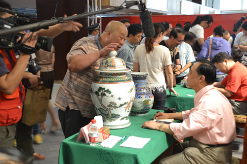 镇平网讯 (记者 傅俊珂) 9月12日,来自全国各地的3000多位藏友们带着9627件藏品来到央视《寻宝—走进镇平》海选现场——镇平县石佛寺镇玉文化中心广场参加藏品海选。本次海选藏品珠宝玉石、陶瓷、书画、青铜、杂项5项,每人限带3件藏品参加。央视《寻宝》栏目组织的珠宝玉器鉴定专家欧阳朝霞、古陶瓷鉴定专家邱小君、书画鉴定专家李学伟、青铜器鉴定专家贾文忠、杂项鉴定专家陈建明五位专家对参选藏品进行初步评选。通过初选筛选出50件宝物进入最后“专家评鉴”的复选阶段。据统计,本次海选由来自福建、江苏、安徽、湖北、陕西及省内各地的3000多位藏友9627件藏品参加。图为海选现场。