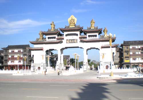 国际玉城位于镇平县石佛寺镇,内有玉神阁、玉文化广场、石佛禅寺等主要景点。整座玉城的建筑风格中融入了深深的佛教文化。玉城的大门就是一处代表:大门高