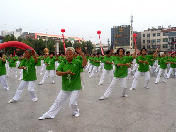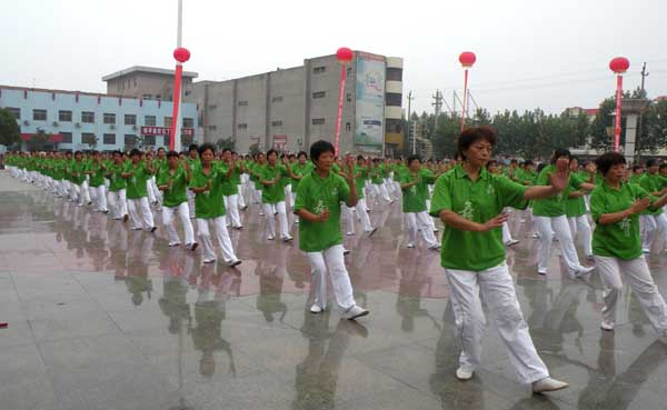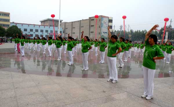 8月8日,在镇平县文体广场1100余人迎着晨曦做广播操、打太极拳,迎接七届全国农运会的到来。据悉,8月8日~9月1日,镇平县在文体广场、中心广场、玉鼎广场、雪枫广场和锦汇广场分区开展以“为南阳第七届全国农运会增光添彩”的“全民健身日”系列活动,为农运会营造声势。