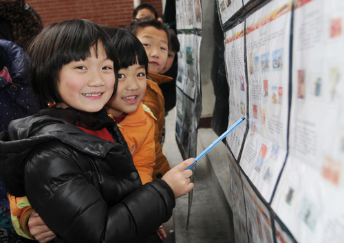 (记者 刘理政 通讯员 郭红丽) 方寸浓缩文化精髓,邮票尽显生肖魅力。1月10日,镇平县举办《甲午年》马邮票发行和首届中小学生邮票图稿绘画比赛颁奖活动。来自全县各中小学生的马年作品共计500多幅,经过激烈角逐评选出初中组和小学生组一二三等奖6人,有效地丰富了中小学生的文化生活。图为:中小学生们参观绘画作品。