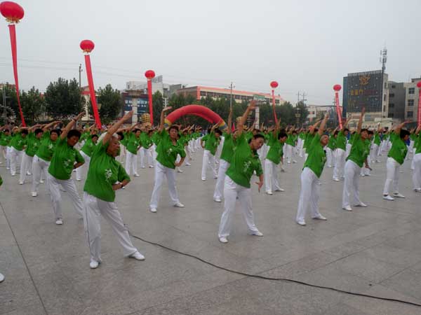 8月8日,在镇平县文体广场1100余人迎着晨曦做广播操、打太极拳,迎接七届全国农运会的到来。据悉,8月8日~9月1日,镇平县在文体广场、中心广场、玉鼎广场、雪枫广场和锦汇广场分区开展以“为南阳第七届全国农运会增光添彩”的“全民健身日”系列活动,为农运会营造声势。